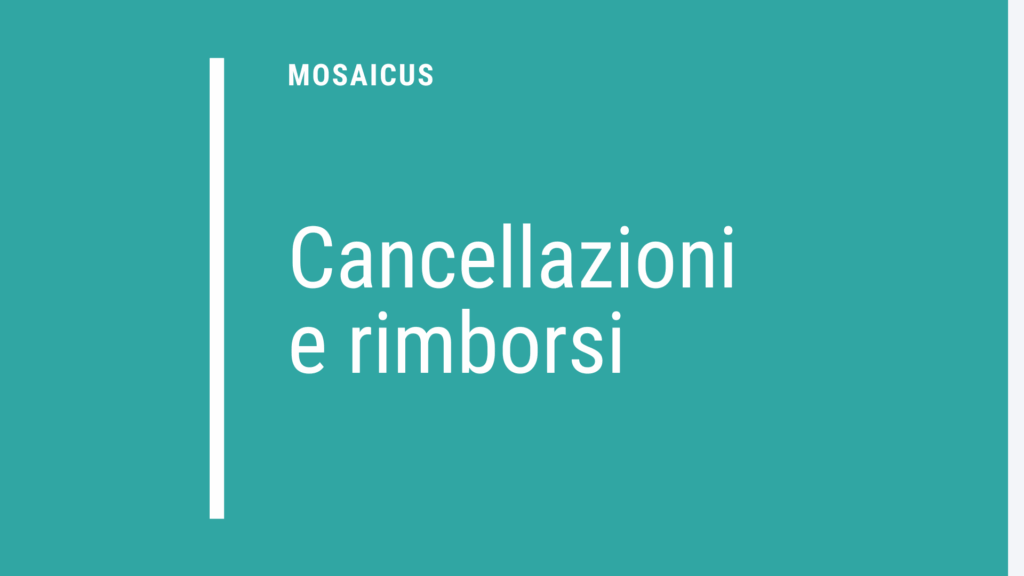 Per qualsiasi dubbio o richiesta sul tema dei rimborsi, puoi contattarci via email all’indirizzo info@mosaicus.com o telefonicamente: saremo felici di aiutarti.